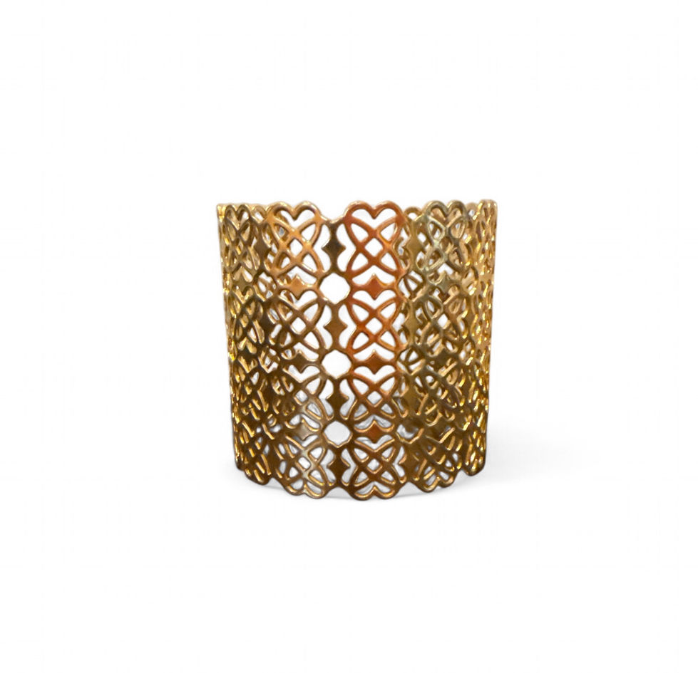The Amara Cuff is a wide, openwork bracelet inspired by traditional Mediterranean patterns. Made from brass and finished in 18K gold plating, it features a lace-like cutout design that feels both bold and lightweight.