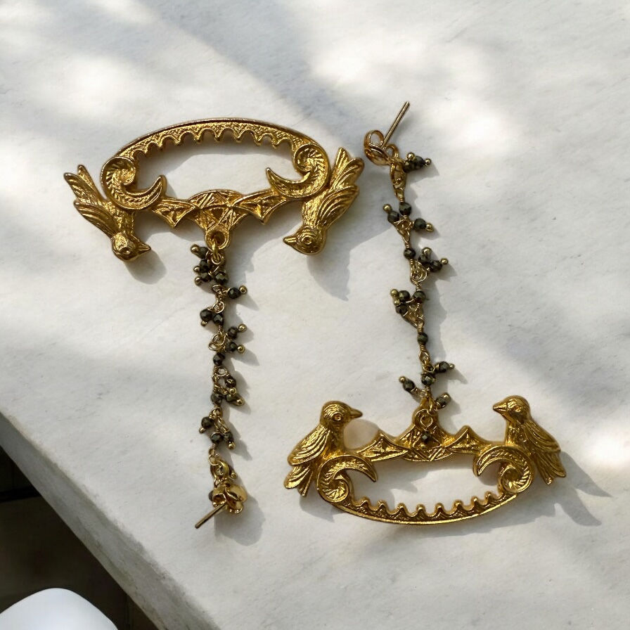 The Ayla Songbirds earrings are a romantic tribute to tradition, featuring two delicately sculpted birds resting on an arched 18K gold-plated base. Between them, a shimmering chain of metallic gray crystals adds gentle motion and elegance with every turn of the head.