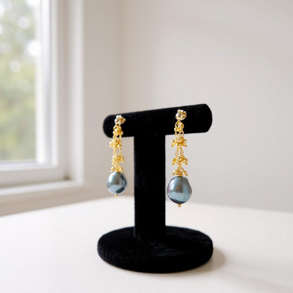 The Pearl Swing Earrings feature a naturally shaped blue baroque pearl suspended from a cascading beaded chain.