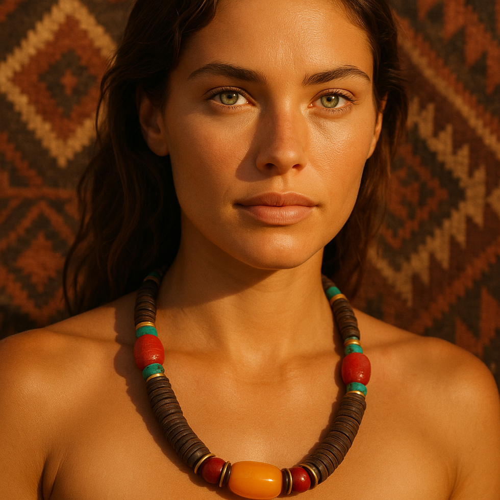 Named after the Swahili word for “beautiful,” the Zuri Heishi Necklace is a striking piece rooted in cultural tradition. Crafted with hand-cut African Heishi beads in deep brown, the design is balanced by a warm amber centerpiece, bold red and turquoise accents, and a mix of bone, shell, and brass elements. Every bead is thoughtfully placed to honor ancestral craft and natural materials, creating a necklace that feels grounded, storied, and strong.
